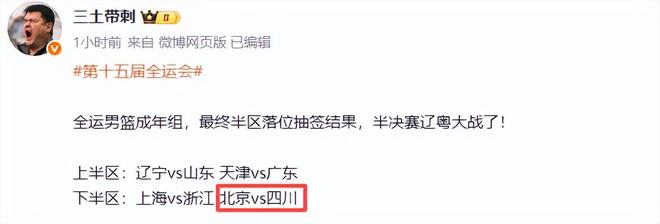 好了,好戏很快开演,昨天各队已结束小组赛赛程,11月10日将进入淘汰赛。今天全运男篮成年组的抽签结果出来了,辽宁、山东、天津、广东在上半区,对阵情况是辽宁vs山东,天津vs广东。下半区的球队是上海、浙江、北京、四川,对阵情况是上海vs浙江,北京vs四川,下半区的戏份最多,也特别有趣。